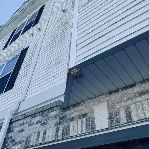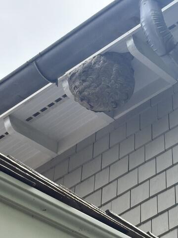This customer in Oakhurst, NJ, has a large bald-faced hornet's nest on the soffit area of her home. Using our extendable pole, we liberally treated the nest with a knockdown aerosol application and then a knockdown dusting product. Both of these treatments will exterminate the bald-faced hornets quickly. After some time had passed, we removed the nest, properly disposed of it, and then applied a liquid non-repellant residual to the area where the nest was. This will neutralize any bald-faced hornets that return to this area and prevent them, and any other stinging insect, from building a new nest.