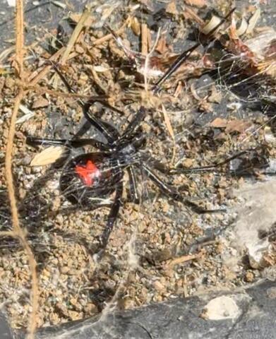 Female black widows are shiny black, with a red-orange triangular markings that look like an hourglass. They use a silk-like substance to weave tangled-looking webs, typically close to the ground in covered or dark places, such as near drain pipes or under logs. The female black widow spider hangs upside down in the web to await her prey, exposing her bright markings as a warning to potential predators and their venom is reported to be 15 times stronger than that of a rattlesnake! Fortunately, they only bite humans when they are disturbed. So don't disturb them!