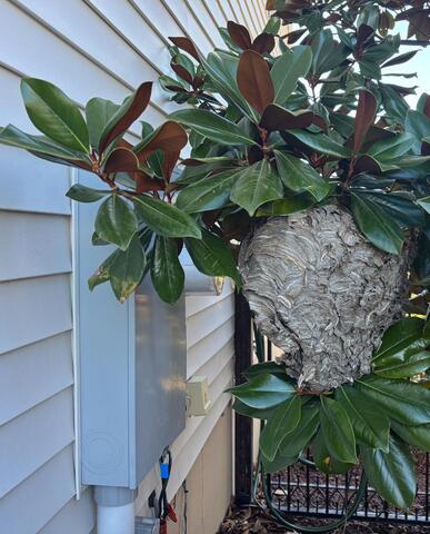 During a regular scheduled service for a Home Protection Plan customer in Wall Township, NJ, we found something very interesting hiding behind a shrub in the backyard...a bald-faced hornets nest! Bald-faced hornets are known to be one of the most extremely aggressive stinging insects out there. They sense vibrations in the air and if anyone or anything comes remotely close to their nest, they will attack in full force!
