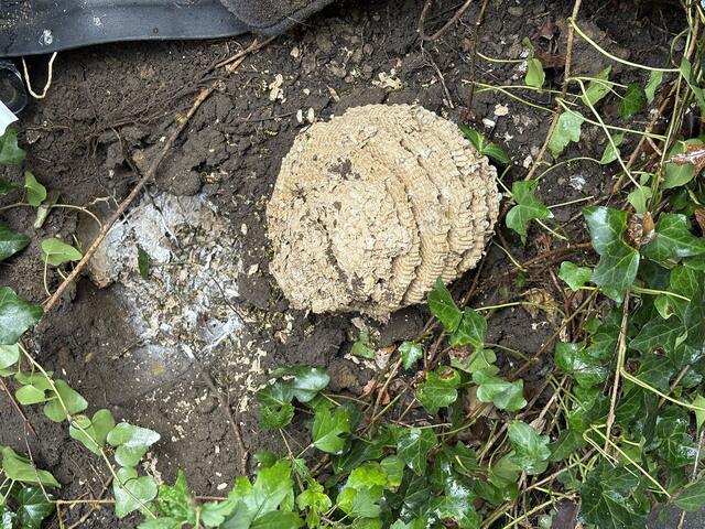 After thoroughly inspecting the backyard, we found their nest! It was in the ground, hidden underneath a pile of discarded mats. We then treated the nest with a knockdown dusting application, which is going to quickly exterminate the yellow jackets. After several moments had passed we dug up the nest, disposed of it properly, and then filled in the hole.