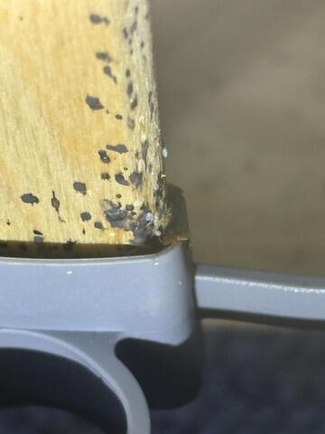 I was called out to a Red Bank residence. The homeowner had called Cowleys after seeing a "pile of wood shavings on the porch" that she correctly suspected was caused by insects. Sure enough, as I was walking up the porch stairs while inspecting the property, I observed a large pile of “sawdust” wood shavings under the railing. I immediately recognized this as carpenter bee frass, the tell-tail sign of carpenter bees. This material collects below any holes where the bees have been boring into the wood.