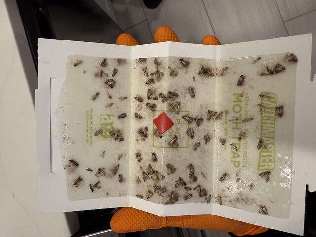 After noticing heavy activity on our monitoring devices, we treated all the cracks and crevices throughout the storage area with an aerosol application. This application rapidly exterminates the Indian meal moths. Next, we installed several pheromone traps to catch the adult Indian meal moths that were flying around. These devices have a unique pheromone in them that lures the Indian meal moths to their demise. Finally, we installed new monitoring devices and then scheduled some additional follow-up inspections to replace the devices, monitor the infestation, and apply any additional treatments if necessary.